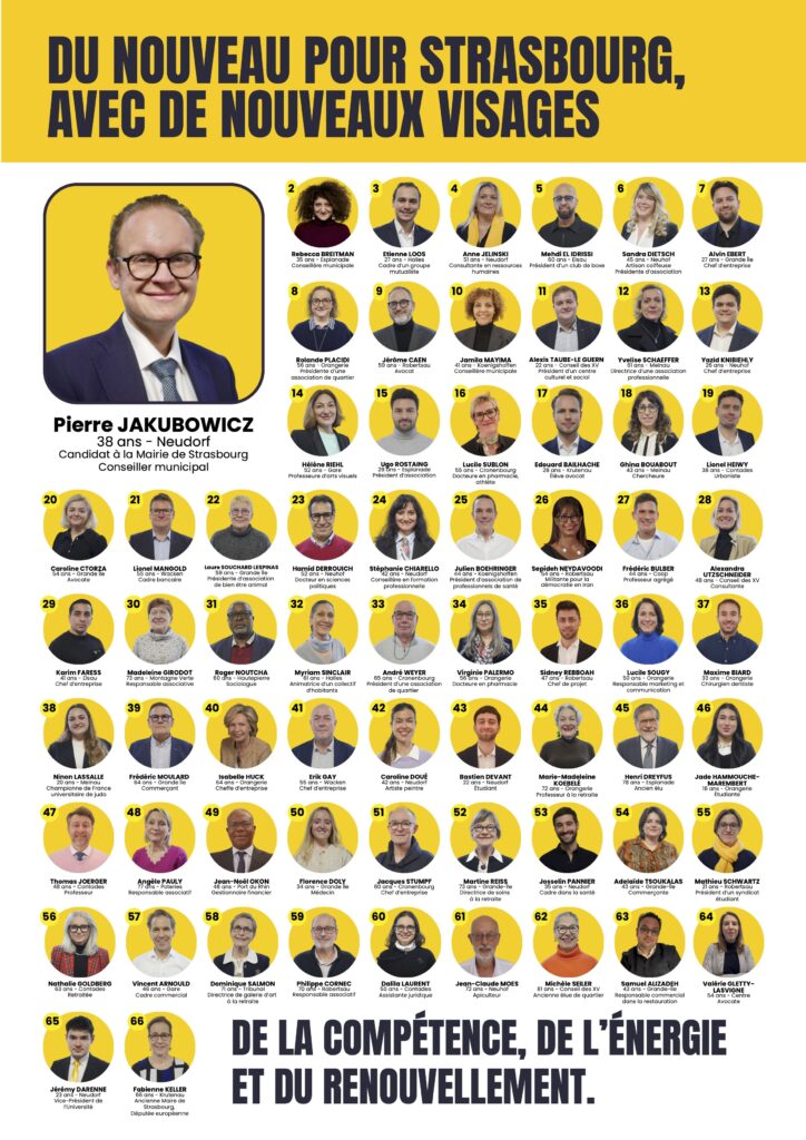 Cette liste de la compétence, de l’énergie et du renouvellement incarne tout ce que Strasbourg a de meilleur, la diversité et la richesse de ses quartiers, la force et la détermination de ses habitants. Ensemble, nous somme la liste du nouveau pour Strasbourg :