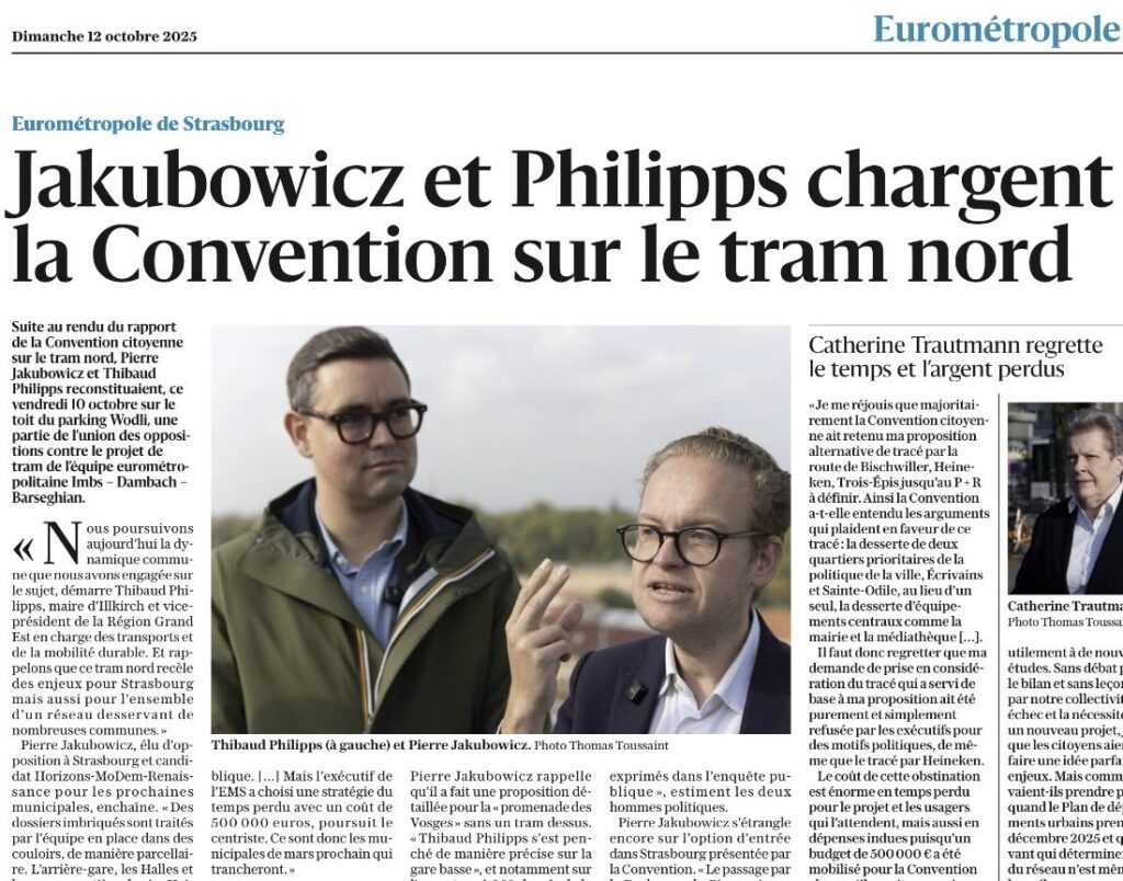 Ce jeudi 9 octobre, la convention citoyenne sur le Tram Nord a rendu ses conclusions. Avec Thibaud Phillipps, maire d’Illkirch-Graffenstaden, nous avons tenu une conférence de presse pour réagir à cette restitution. Je tiens d’abord à remercier les citoyens qui se sont investis dans cette démarche, souvent dans un cadre contraint et avec une méthode discutable. Nous avons, depuis le début du mandat, porté une vision d’ensemble des mobilités dans l’Eurométropole : efficace, intermodale et pensée à l’échelle du territoire.